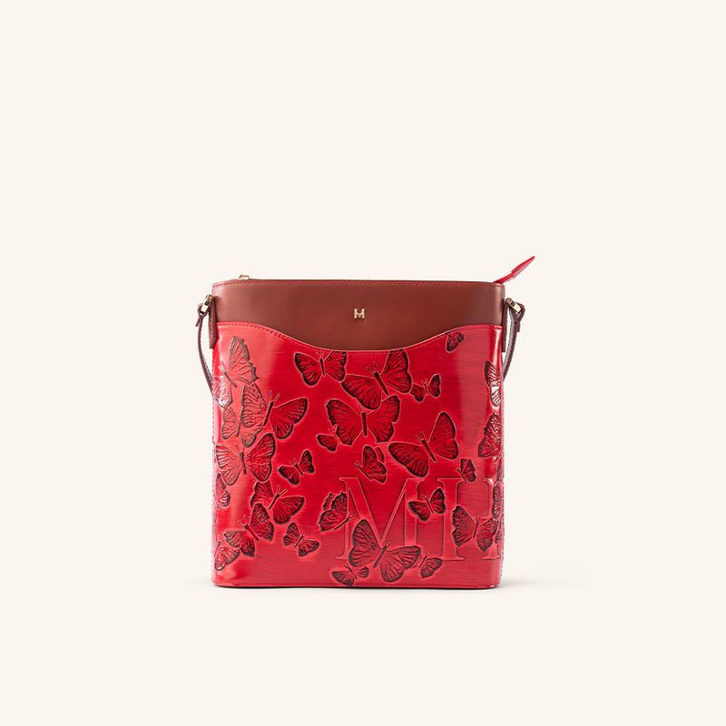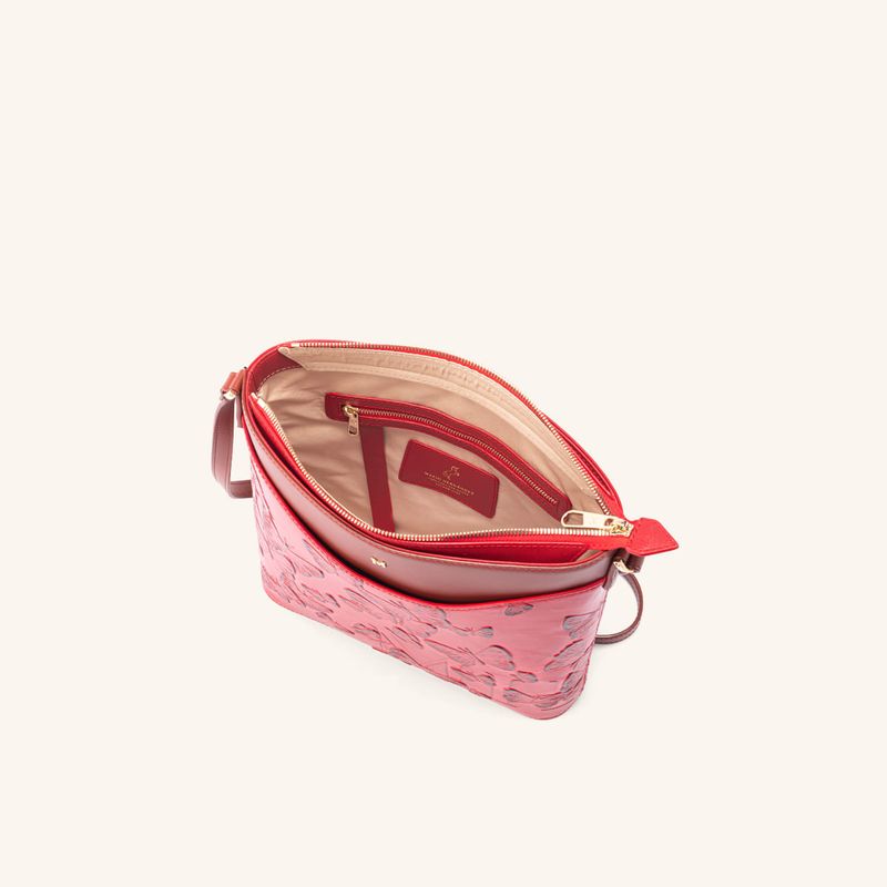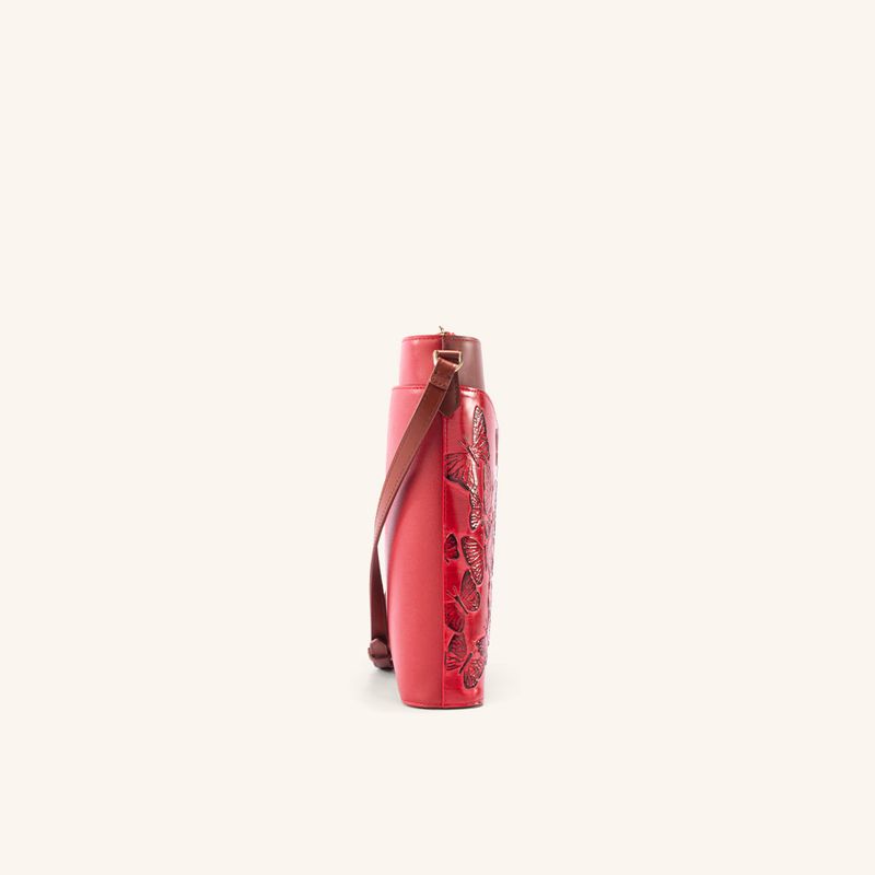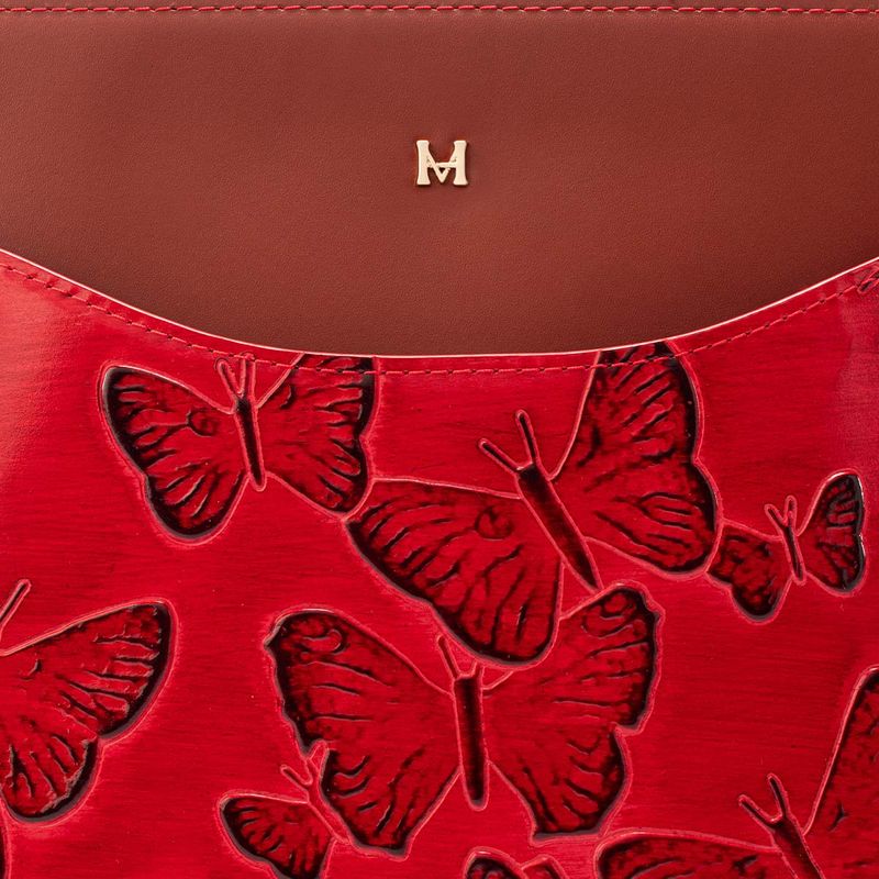 The deep red that bathes the Italian leather of this limited edition from the brand's iconic collection is reminiscent of ripe, juicy berries. The embossed butterflies gain vibrancy through a sun-kissed effect on the leather, achieved through an exclusive dyeing process known as tamponado. This handcrafted technique, performed in Italy, gives the pieces in the line a vibrant, warm, and lively appearance, harmoniously complementing the crimson leather found primarily in handbags and wallets. Each design becomes the centerpiece of the look, imbuing it with an energy that is both intense and elegant; an expression of powerful and confident femininity, designed for women who seek unique pieces that reflect their inner strength and singular beauty.