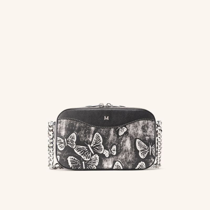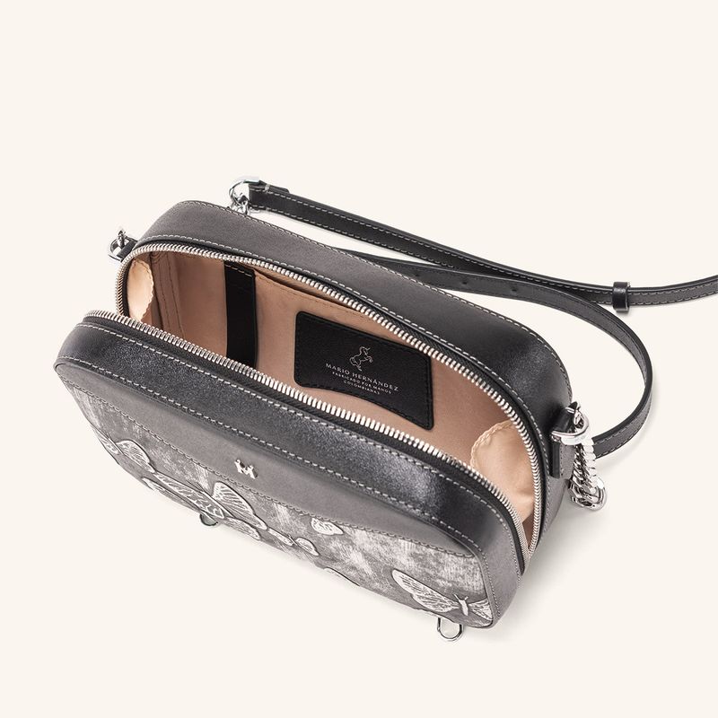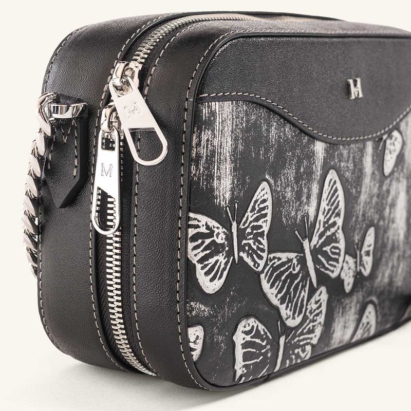 A worn platinum effect, reminiscent of medieval armor, gives this new version of the brand's iconic collection a strong yet delicate appearance, thanks to the delicate butterflies embossed on the Italian leather that appear sculpted in metal. The depth of this hand-dyed work is created by the contrast between black and white, resulting in a timeless and distinctive metallic tone, ideal for women who leave their mark.