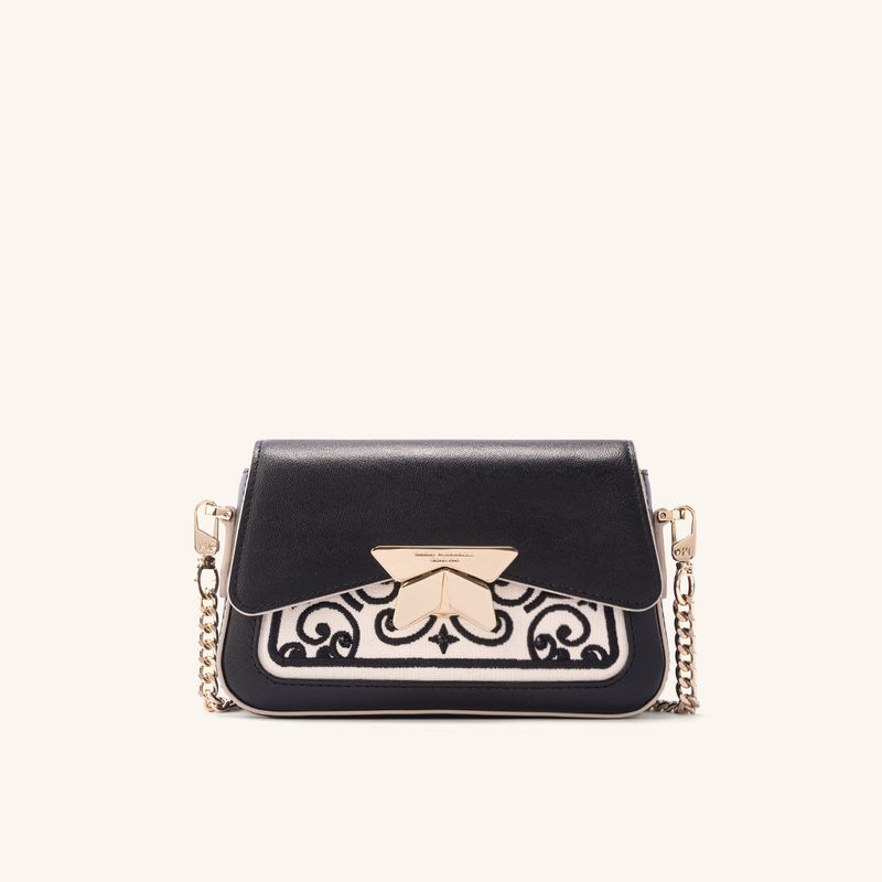 SAGRADA is an evolution of AZULEJO, a collection that evokes the motifs of tiles of yesteryear. In this new version, we raised the level of craftsmanship and the beauty of the finishes to give the design a divine elegance. Each piece in the line, made of leather and high-quality cotton textile, displays a beautiful pattern of curved lines, inspired by the brand's iconic butterflies, which is double-embroidered: the first done digitally to ensure a flawless finish and the second manually to ensure that each Swarovski crystal is beautifully arranged.