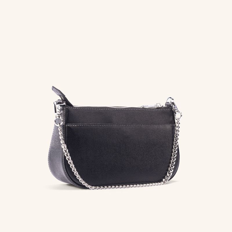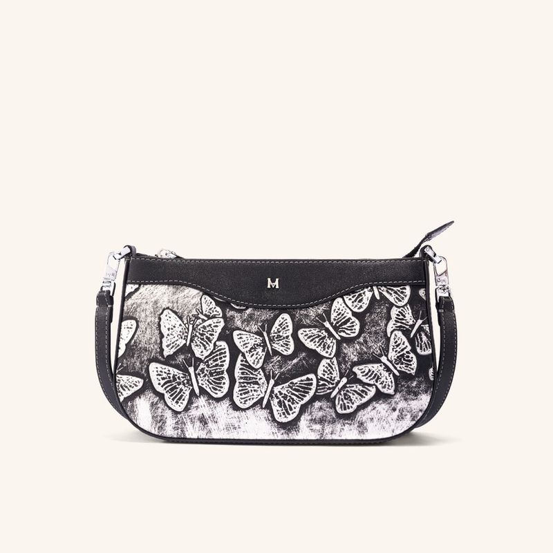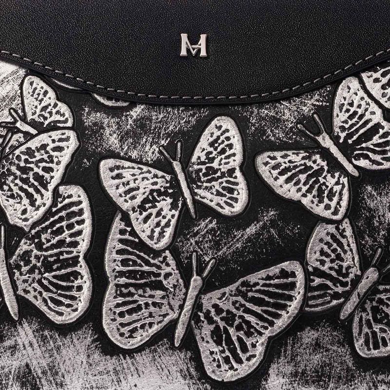 A worn platinum effect, reminiscent of medieval armor, gives this new version of the brand's iconic collection a strong yet delicate appearance, thanks to the delicate butterflies embossed on the Italian leather that appear sculpted in metal. The depth of this hand-dyed work is created by the contrast between black and white, resulting in a timeless and distinctive metallic tone, ideal for women who leave their mark.
