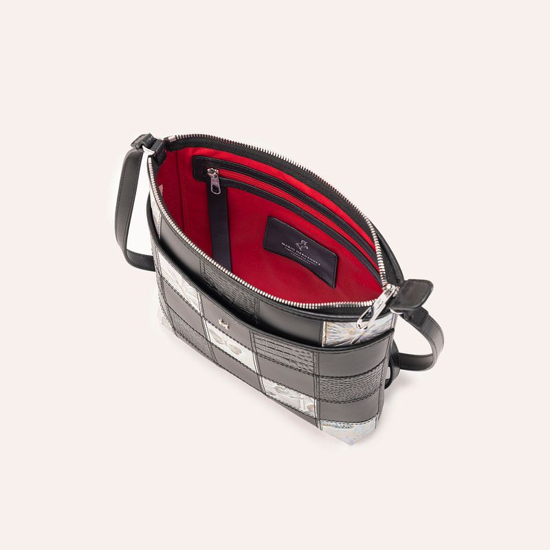 Created with the help of artificial intelligence, this collection of wallets and small leather goods mixes, like a patchwork, leathers of different colors and textures to create a checkered optical effect that cathces the eye no matter the outfit.