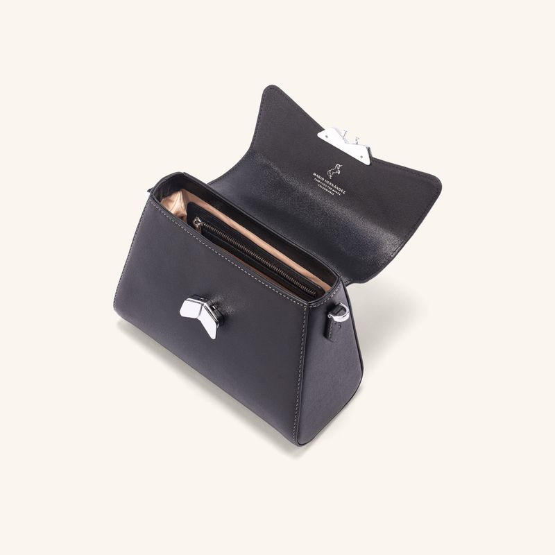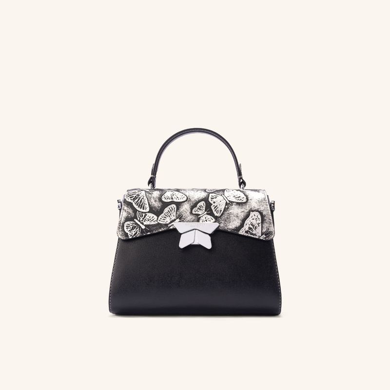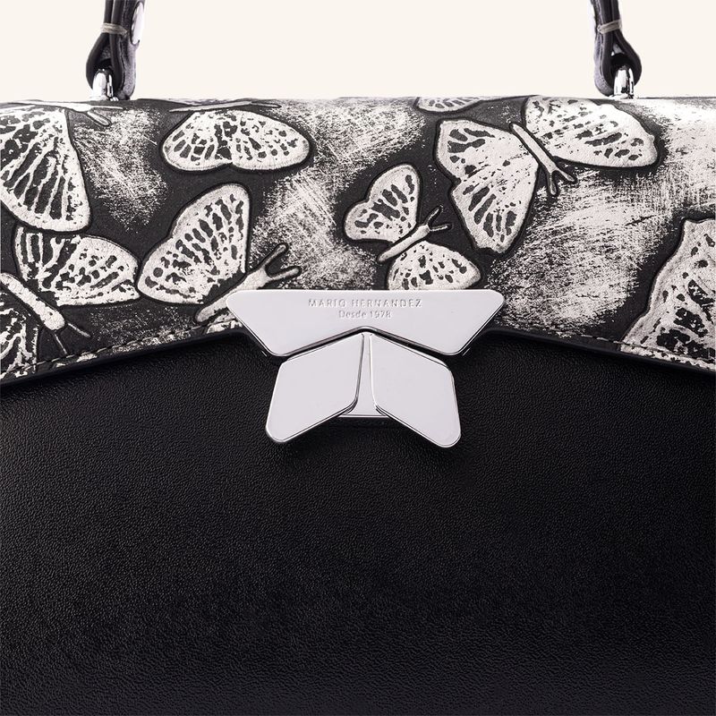 A worn platinum effect, reminiscent of medieval armor, gives this new version of the brand's iconic collection a strong yet delicate appearance, thanks to the delicate butterflies embossed on the Italian leather that appear sculpted in metal. The depth of this hand-dyed work is created by the contrast between black and white, resulting in a timeless and distinctive metallic tone, ideal for women who leave their mark.