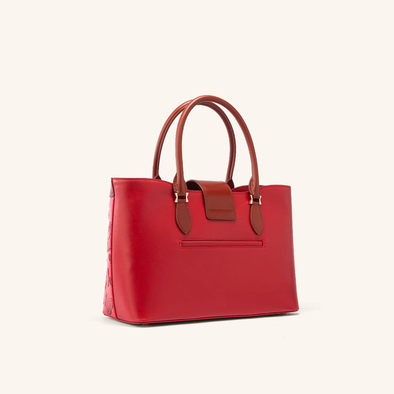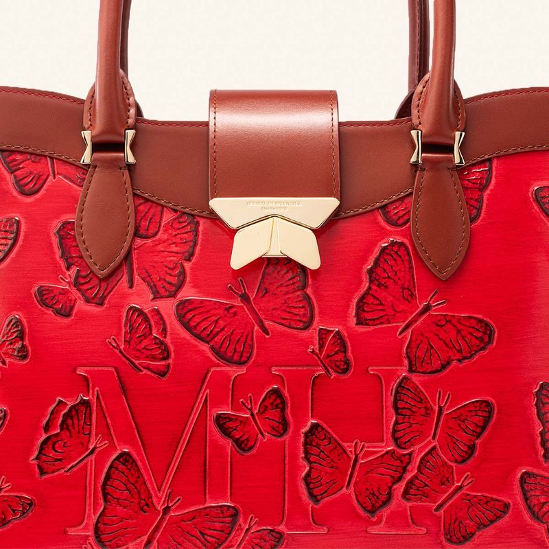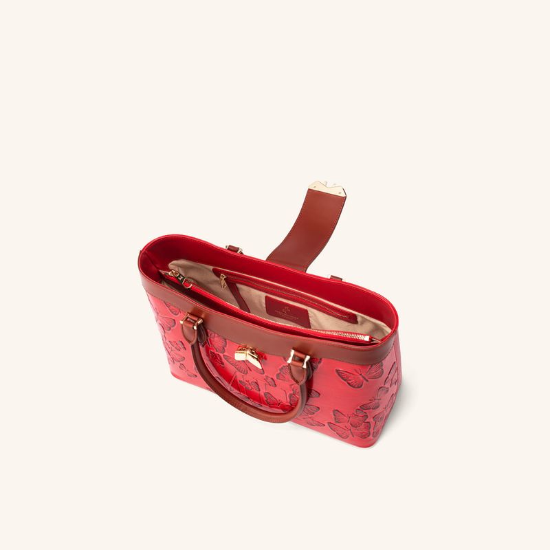 The deep red that bathes the Italian leather of this limited edition from the brand's iconic collection is reminiscent of ripe, juicy berries. The embossed butterflies gain vibrancy through a sun-kissed effect on the leather, achieved through an exclusive dyeing process known as tamponado. This handcrafted technique, performed in Italy, gives the pieces in the line a vibrant, warm, and lively appearance, harmoniously complementing the crimson leather found primarily in handbags and wallets. Each design becomes the centerpiece of the look, imbuing it with an energy that is both intense and elegant; an expression of powerful and confident femininity, designed for women who seek unique pieces that reflect their inner strength and singular beauty.