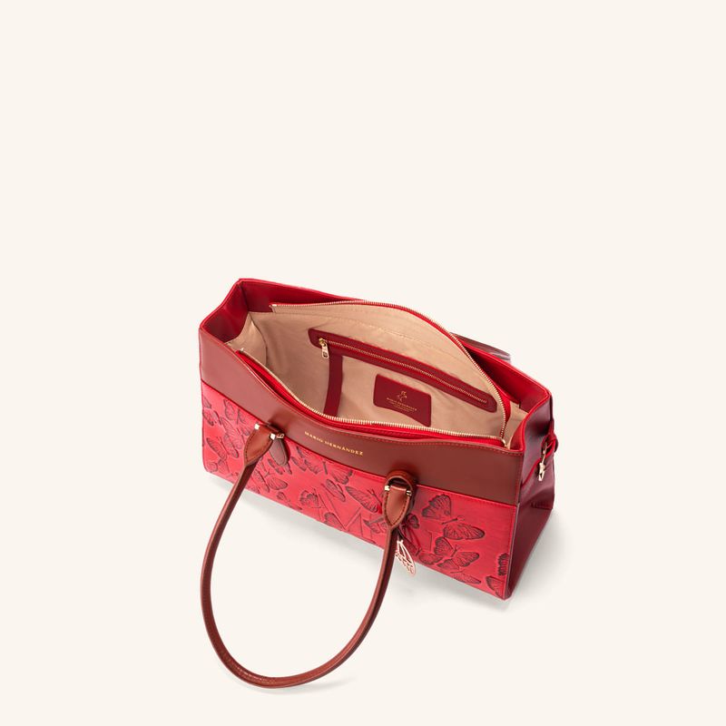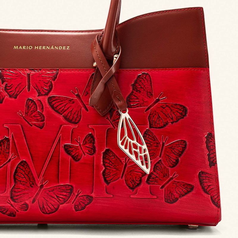The deep red that bathes the Italian leather of this limited edition from the brand's iconic collection is reminiscent of ripe, juicy berries. The embossed butterflies gain vibrancy through a sun-kissed effect on the leather, achieved through an exclusive dyeing process known as tamponado. This handcrafted technique, performed in Italy, gives the pieces in the line a vibrant, warm, and lively appearance, harmoniously complementing the crimson leather found primarily in handbags and wallets. Each design becomes the centerpiece of the look, imbuing it with an energy that is both intense and elegant; an expression of powerful and confident femininity, designed for women who seek unique pieces that reflect their inner strength and singular beauty.