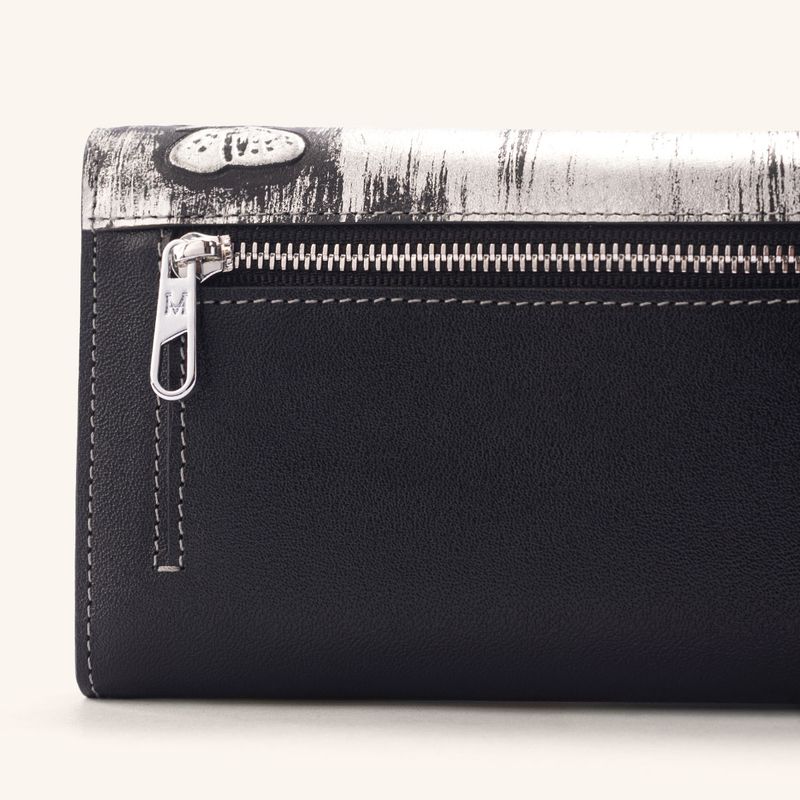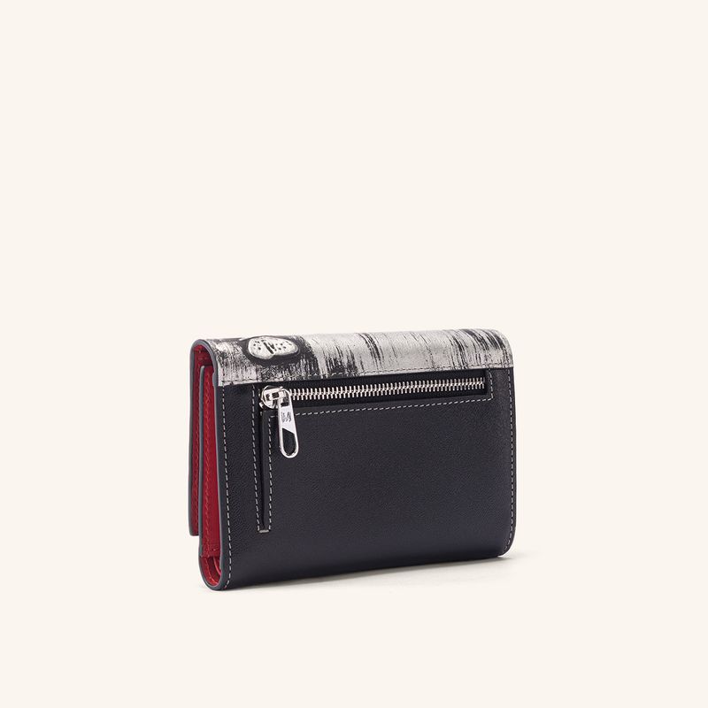 A worn platinum effect, reminiscent of medieval armor, gives this new version of the brand's iconic collection a strong yet delicate appearance, thanks to the delicate butterflies embossed on the Italian leather that appear sculpted in metal. The depth of this hand-dyed work is created by the contrast between black and white, resulting in a timeless and distinctive metallic tone, ideal for women who leave their mark.